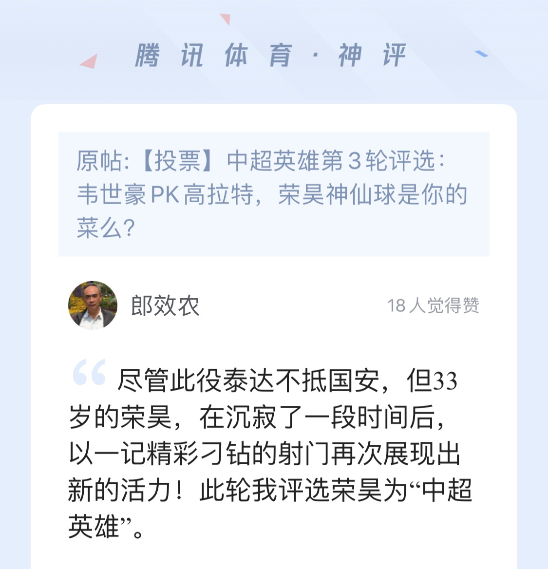 2020年腾讯体育中超英雄评选进行了改版,在保留专家评选、网友投票的基础上,增加了优质自媒体的选评板块。