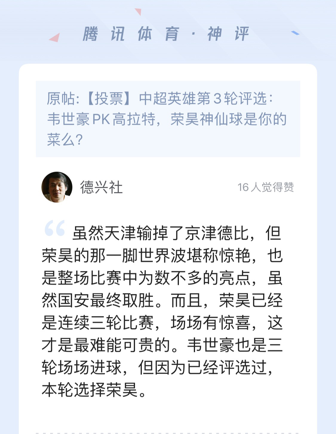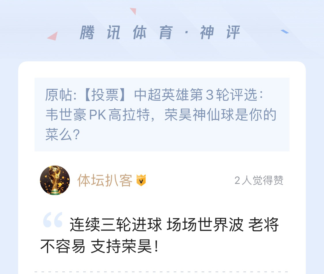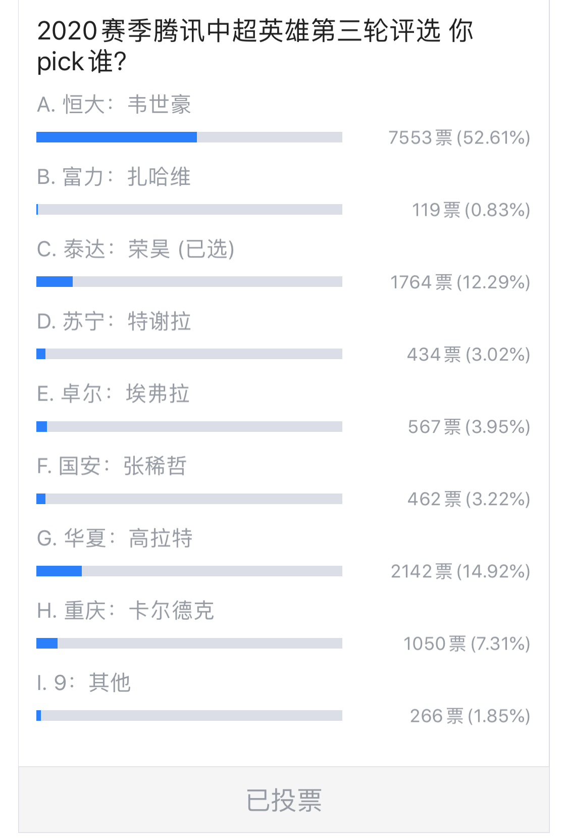 虽然韦世豪的进球只是一个补射,既不是荣昊那般技惊四座,也不如高拉特那样潇洒写意,甚至比不上卡尔德克、埃弗拉这种单骑救主的含金量高。但作为3场4球的本土射手,韦世豪依然征服了超过52%的腾讯网友。中国球迷对武磊之后的本土射手的期待,全在投票数据里了。