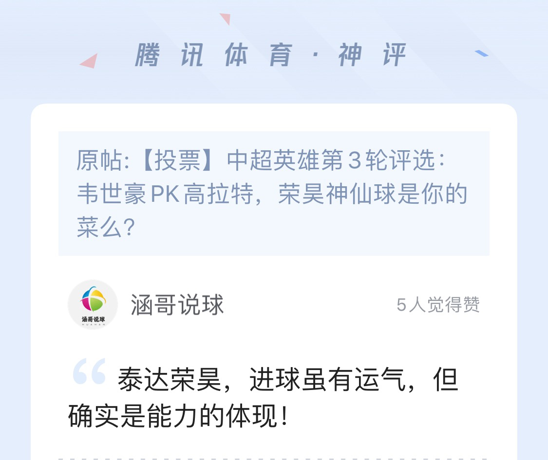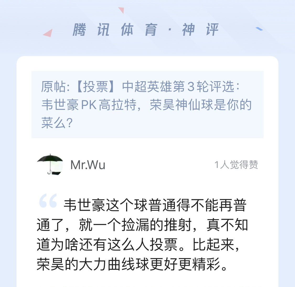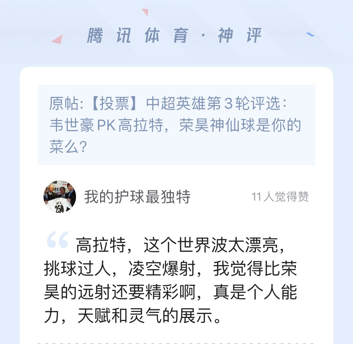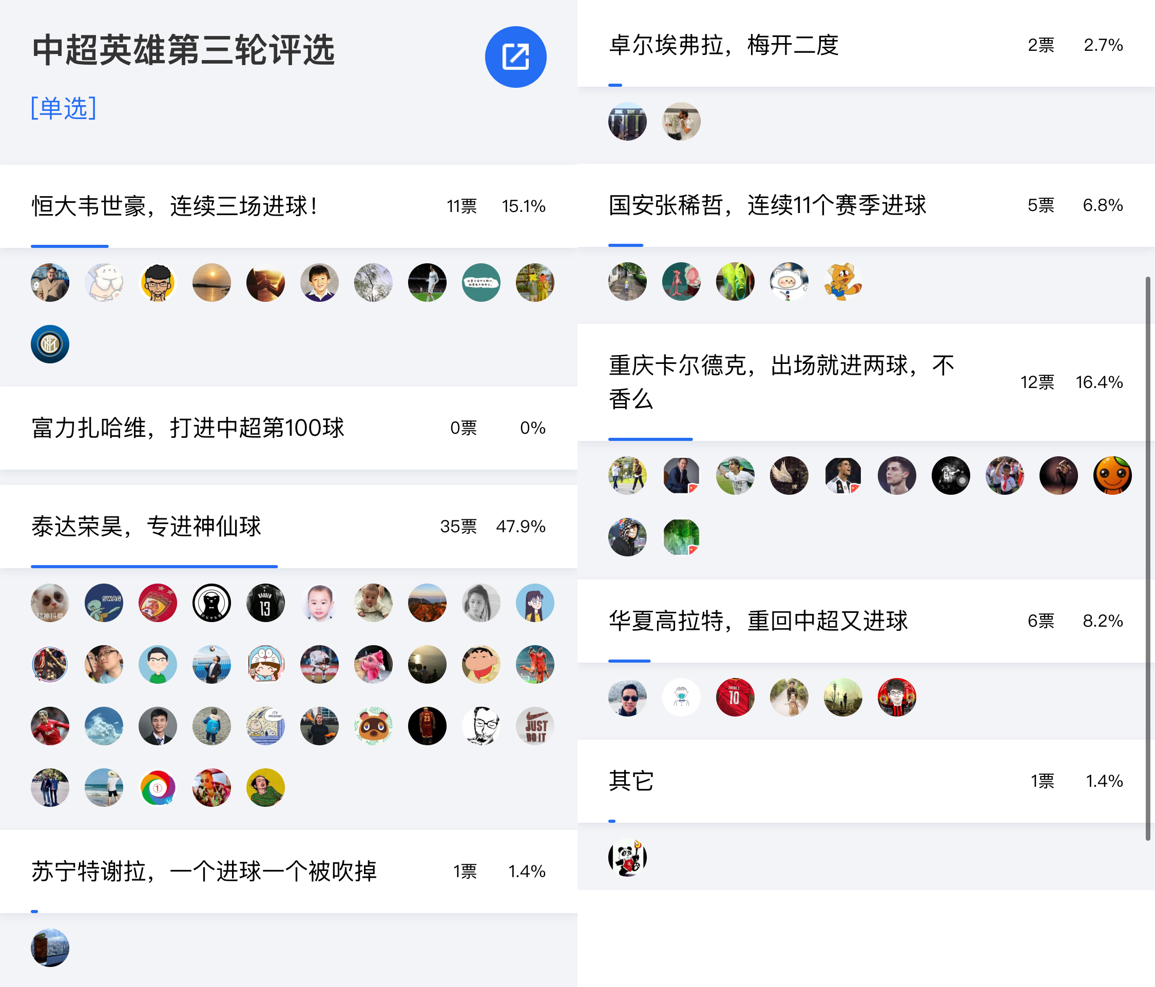 虽然韦世豪的进球只是一个补射,既不是荣昊那般技惊四座,也不如高拉特那样潇洒写意,甚至比不上卡尔德克、埃弗拉这种单骑救主的含金量高。但作为3场4球的本土射手,韦世豪依然征服了超过52%的腾讯网友。中国球迷对武磊之后的本土射手的期待,全在投票数据里了。