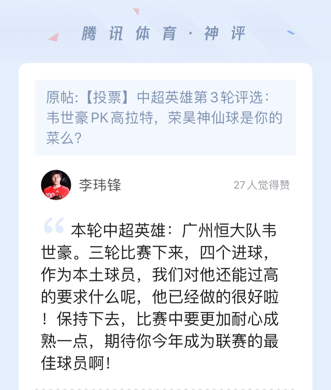 前国足队长李玮锋将票投给了韦世豪,3场4球,肉眼可见成熟的韦世豪,同样值得鼓励。