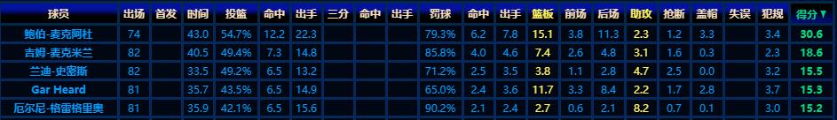 5人分别是22.9分的西亚卡姆、19.4分的洛瑞、17.8分的范弗里特、16分的鲍威尔和15.4分的伊巴卡。