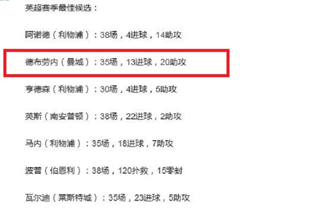 德布劳内获得英超最佳球员,算是实至名归了吧?