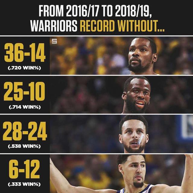 从2016到2019赛季勇士球队拥有库里,克莱,格林,杜兰特四位球星,在此期间取得两连冠,媒体统计缺席其中一位球员时球队取得所取得的战绩。