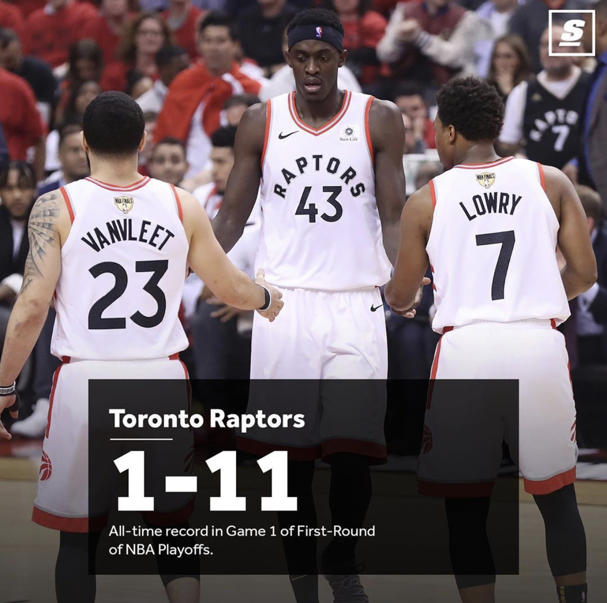 而这竟然是猛龙队史第二次在每赛季的季后赛首场比赛取胜,在此之前他们季后赛首轮首战1胜11负!