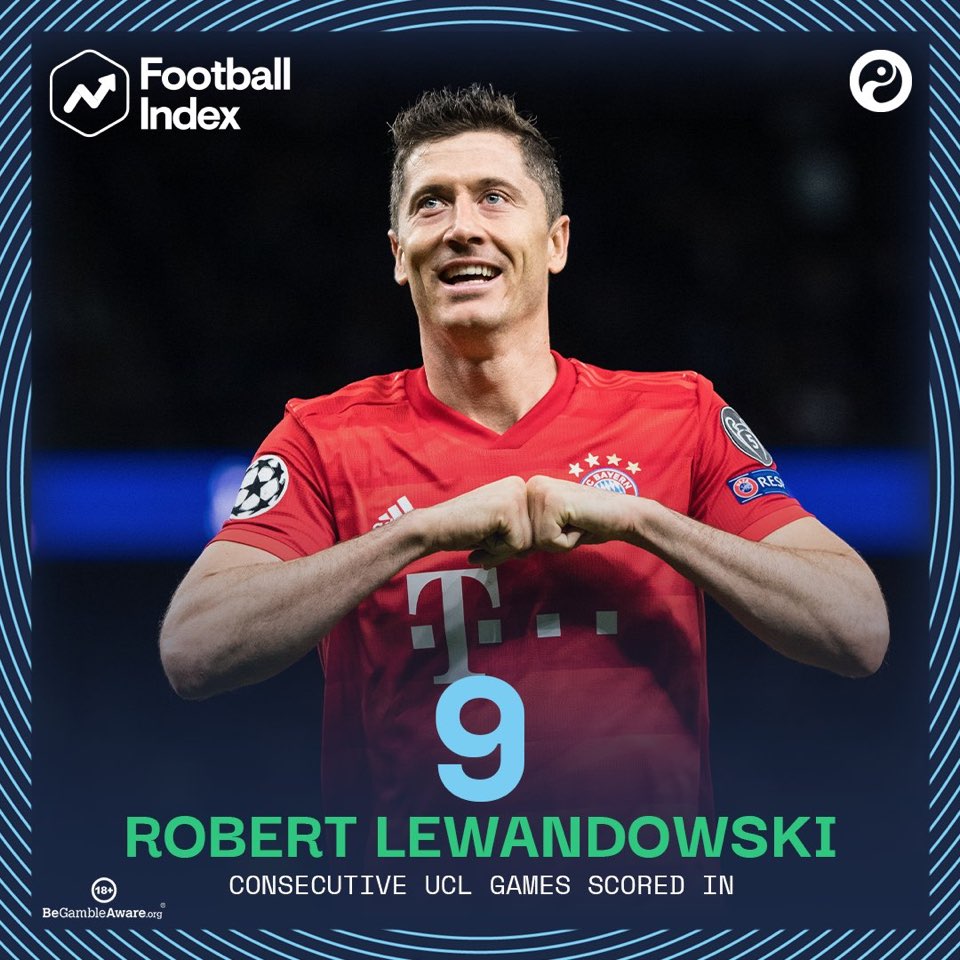 这也是莱万连续9场欧冠进球,追平了范尼,仅次于连续11场欧冠破门的C罗!