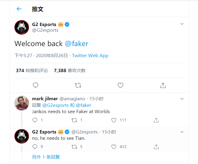 Jankos需要在世界赛上遇到Faker G2:不,他需要遇到Tian