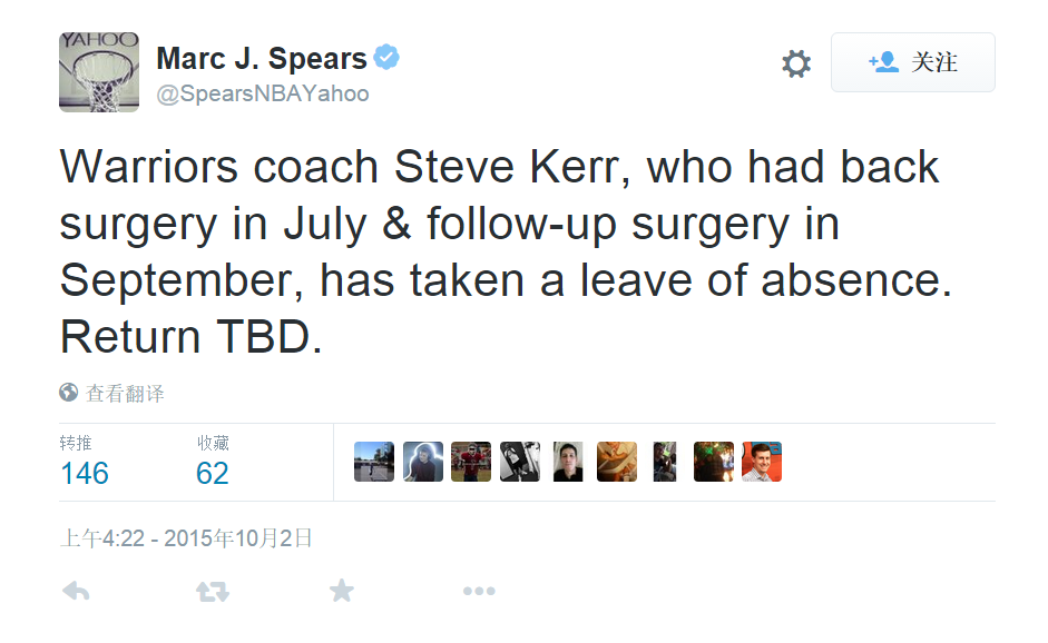 史蒂夫-科尔曾在7月份接受了背部手术,结果因病复发,在9月份又接受手术,现在正在停职休养。期间,勇士队助理教练卢克-沃顿将担任临时主教练。也许您还喜欢:世界杯直播 亚洲杯直播 欧洲杯直播 足球直播