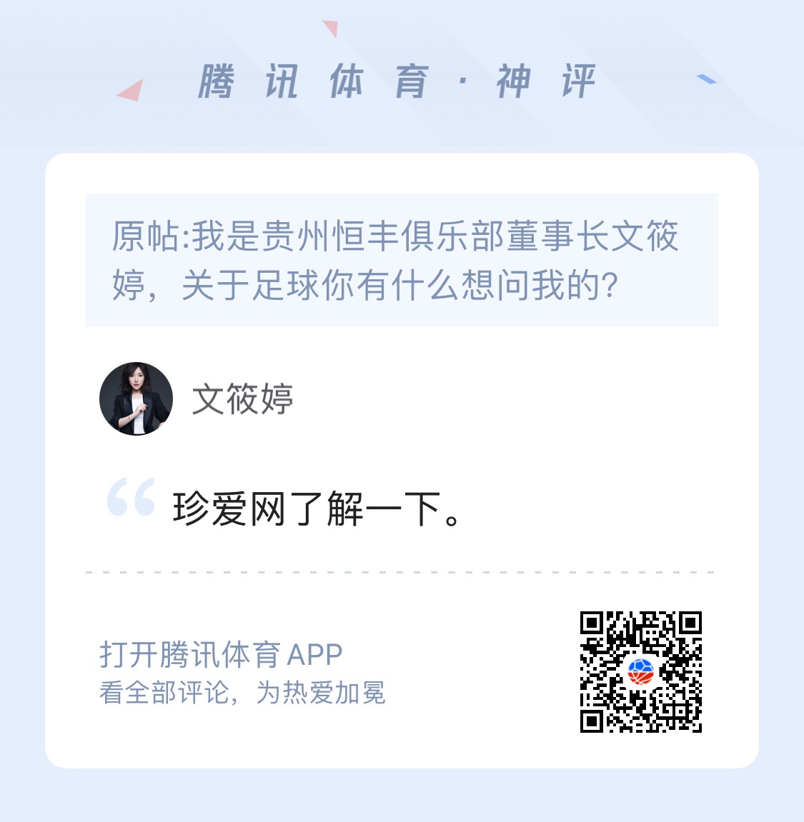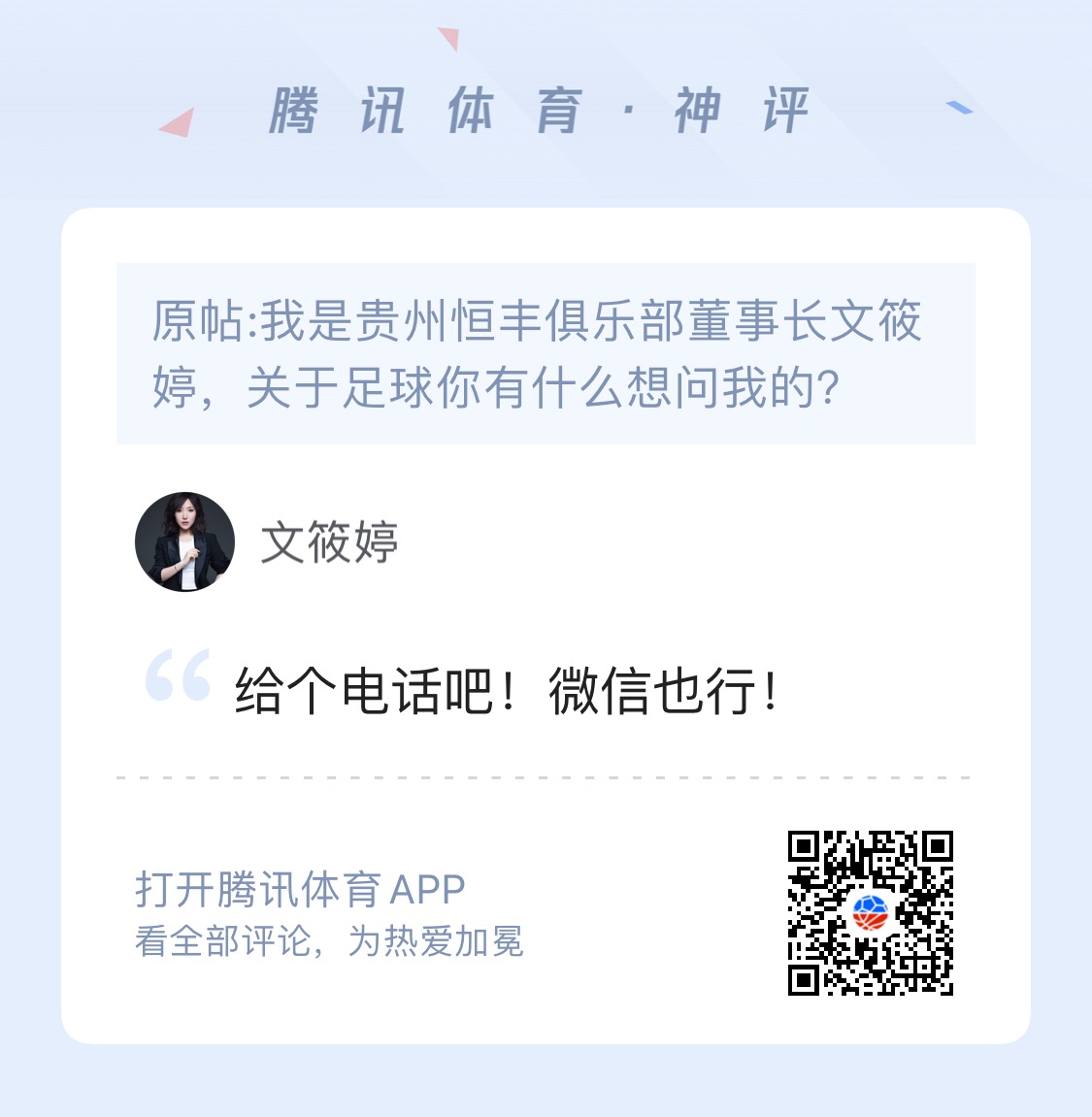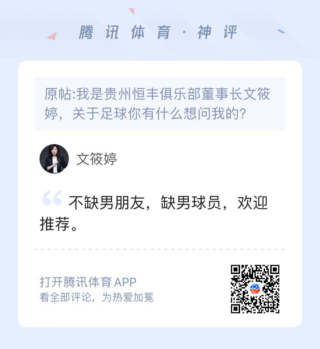 中甲贵州恒丰美女董事长“婷婷子”文筱婷在线互动,当被问及缺不缺男朋友的“敏感话题”时,文总大方应答:不缺男朋友,缺男球员,欢迎推荐!