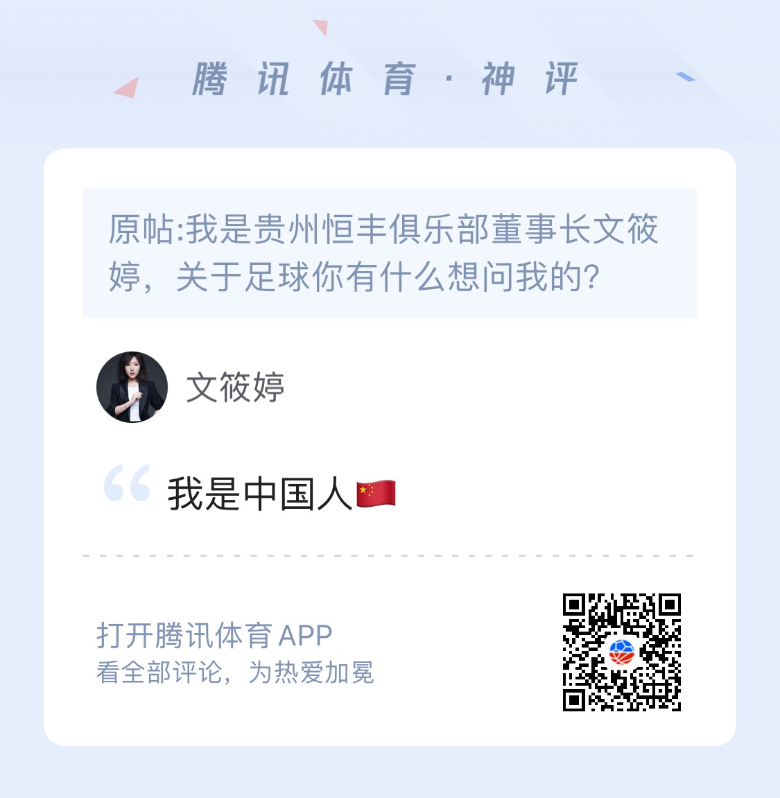 9?问:文姐姐,你好!在中国玩足球不赚钱,请问为什么像你这样的“小”民企(和500强企业或和国企比)也玩足球?作为少东家,你认为贵州足球可以为中国足球做些什么?谢谢。