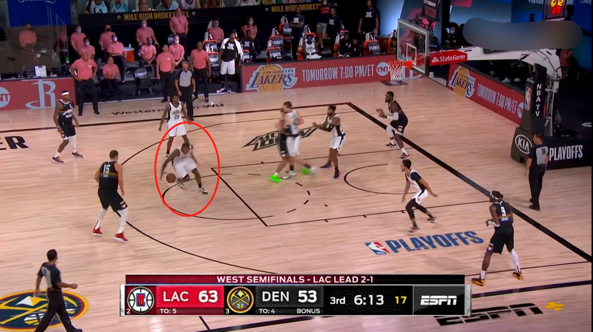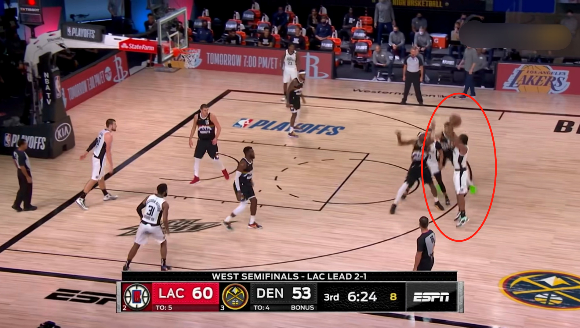 随后在防守端,又是小卡,他的预判精准地拦截掉掘金队的传球,随后小卡迅速持球反击。