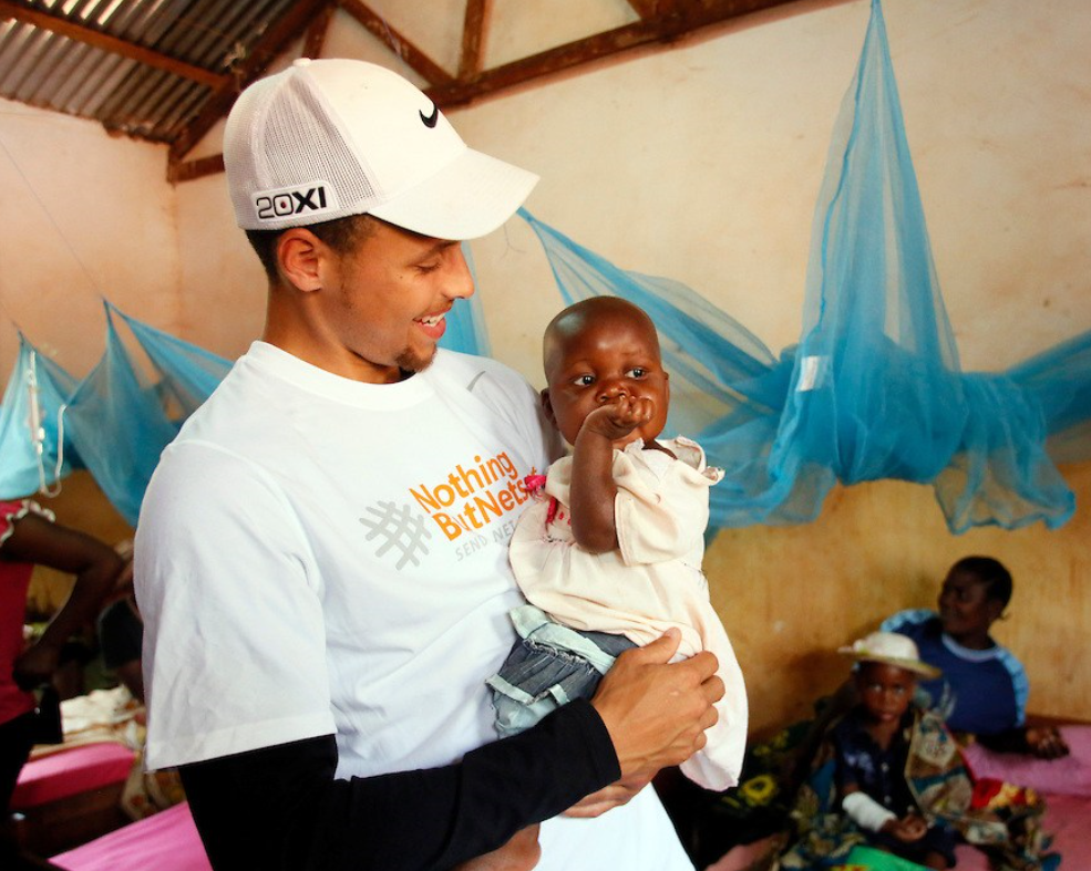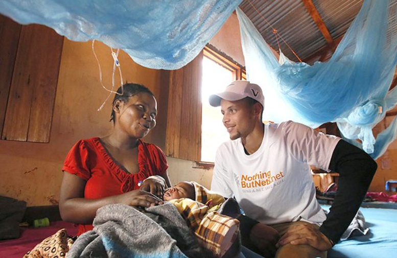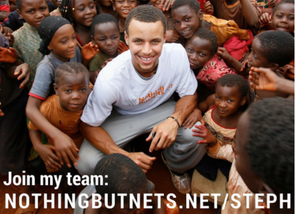 Nothing But Nets?是一个对抗疟疾的世界性的基金会,而疟疾在非洲每两分钟就带走一个孩子的生命,疟疾可以通过蚊虫的叮咬传播,所以蚊帐是对抗它的一个手段。库里在多年前就已经和这家慈善组织达成了一个协议——此后每投进一记三分球,库里都要向非洲捐赠3顶预防疟疾的蚊帐。