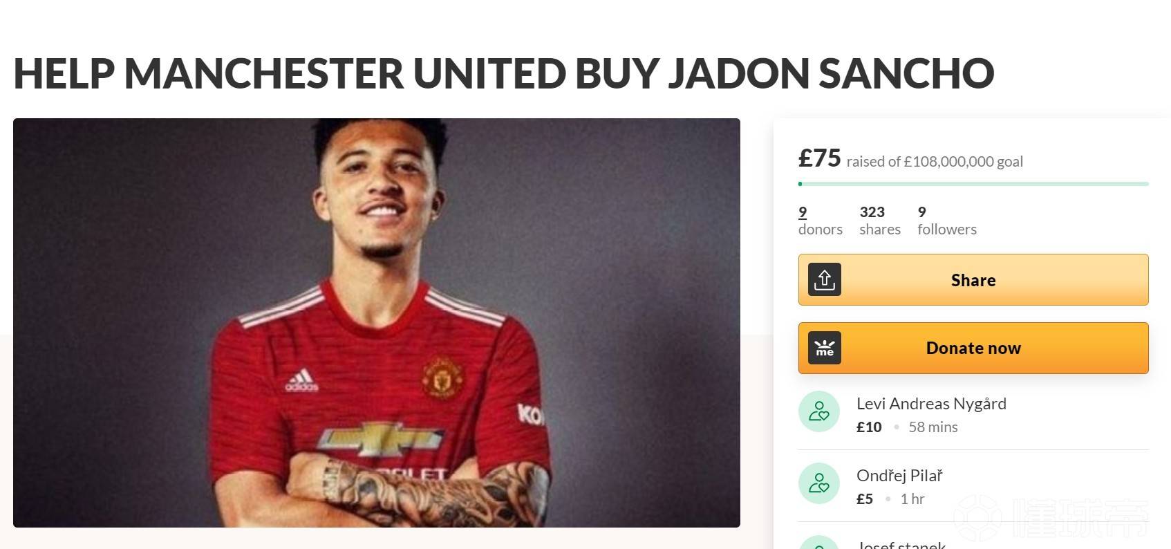 曼联球迷为引进桑乔,在网络上发起了总金额高达1.08亿英镑的众筹项目,目前已筹到了75英镑