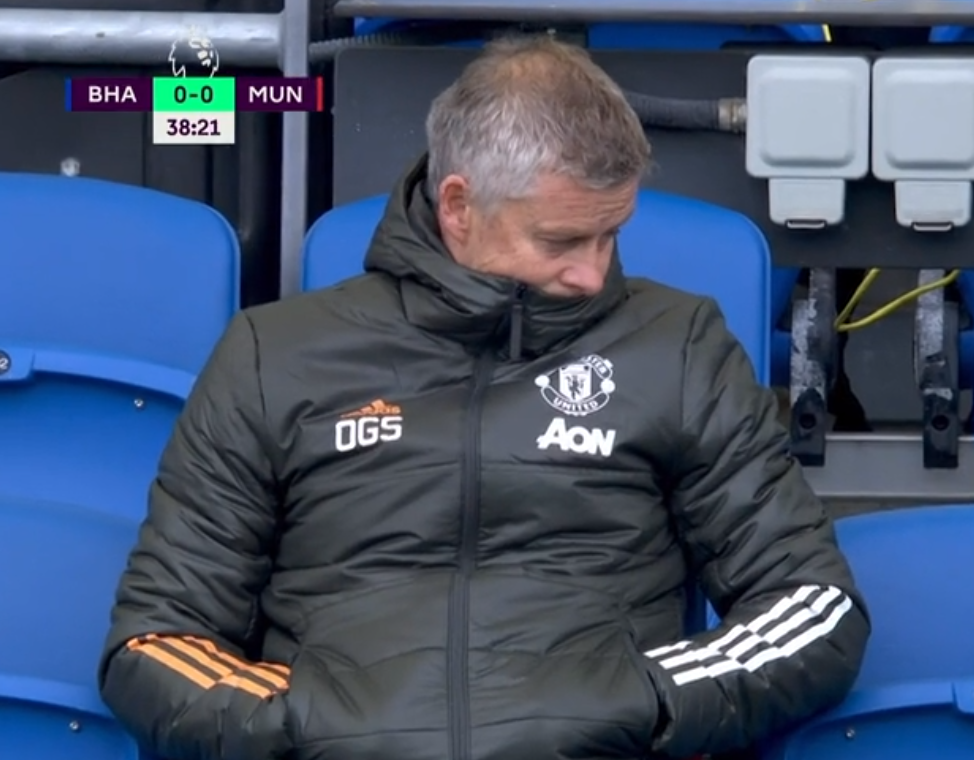曼联被吹点球时,索尔斯克亚一副生无可恋的表情。