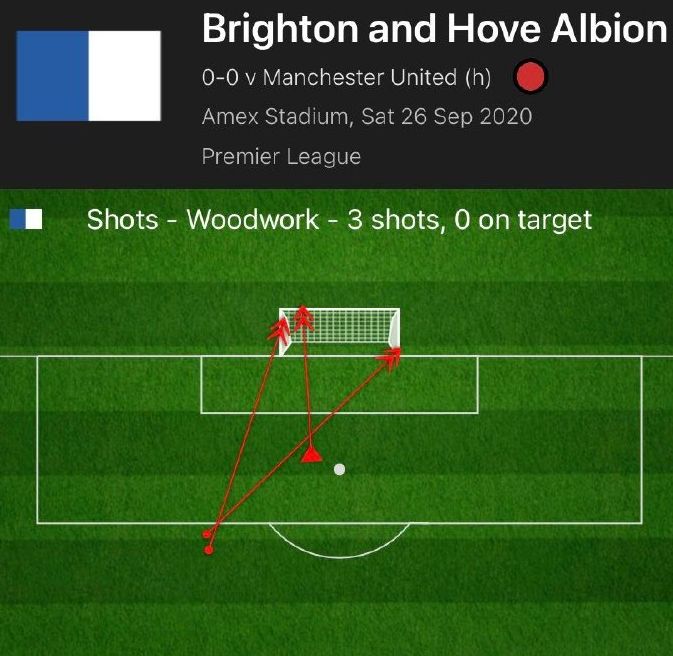 上半场,主场作战的布莱顿攻势凶猛。在通过点球破门之前,他们3次击中了门框,分别是左门柱、右门柱、横梁。