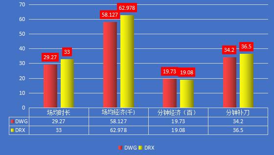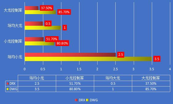 在场均小龙数上,DRX为2.5条,低于DWG的3.5条;在小龙控制率上,DRX同样以51.7%的控制率不及DWG的80.8%;在场均大龙数上,DRX为0.5条,低于DWG的1条;大龙控制率上DRX也是以37.5%的控制率不及DWG的85.7%。