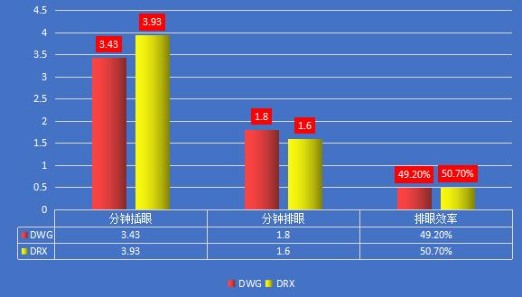 DWG的分钟排眼3.43个,低于DRX的3.93个;DWG的分钟排眼1.8个,高于DRX的1.6个;在排眼效率上,DWG以49.2%的排眼效率低于DRX的50.7%。