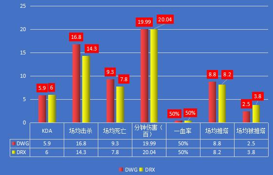 DWG的场均击杀数为16.8次,高于DRX的场均14.3次;在场均死亡数上,DWG也是以场均9.3次,高于DRX的场均7.8次;KDA上,DWG则是以场均5.9稍稍落后于DRX的场均6。