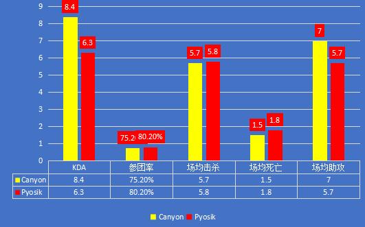 再结合两人的KDA比较,我们可知,Canyon在攻防端的整体表现均优于Pyosik。