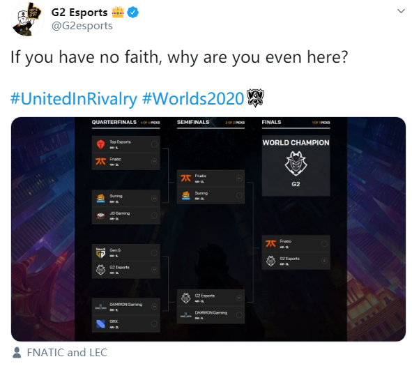 八强战还没开打,G2战队就开始乐观起来了,G2官推直接给出了本次世界赛淘汰赛的晋级图,从晋级图中我们能发现:上半区FNC连克TES和SN杀入决赛,下半区的G2连斩GEN和DWG两强,并且在决赛中再度击败FNC成功夺冠!不得不说这个剧本相当完美(PS:站在G2的角度来看)~对此,G2官推写道:如果你没有信心,那么来这里做什么?