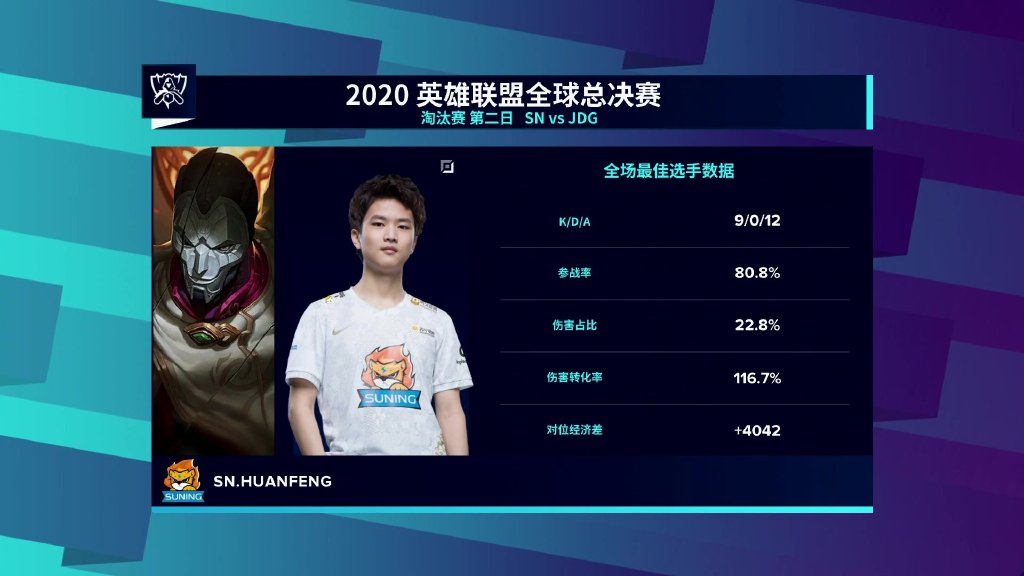 这场淘汰赛结束后,相信所有人都记住了这个来自海边的大男孩——Huanfeng,今年夏季赛才开始征战LPL赛场,但是Huanfeng对线丝毫不惧任何对手。敢操作、有操作、能输出,这些都是Huanfeng的代名词。而在这场电商大战中,Huanfeng一跃成为主角,四局比赛三次拿烬,而三局比赛中Huanfeng很好的承担起了队伍输出的角色,三局均打出了非常Carry的数据,其中两局更是斩获MVP。