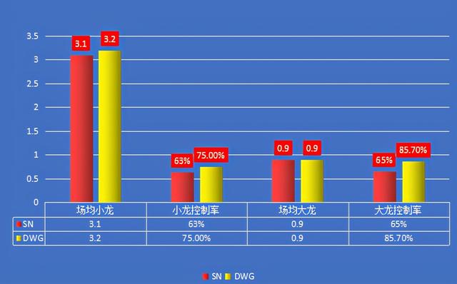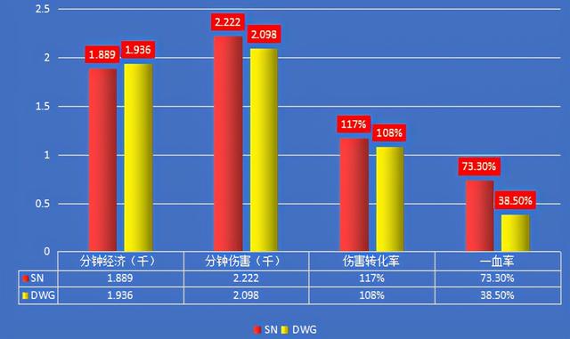 从上图可知,SN在分钟经济(1889)不及DWG(1936)的基础上,分钟伤害则是以2222力压DWG的2098。这说明,SN可利用更少的经济打出更高的输出,即伤害转化率高。再往深了分析那就是,SN在进攻端的欲望和战术发动次数都要强于DWG,这也在一定程度上能说明SN在进攻端的强势性。在一血率上,SN则是以高达73.3%的一血率遥遥领先于DWG的38.5%,这说明SN在前期的进攻节奏更为紧凑,战术布置也相对奏效。.