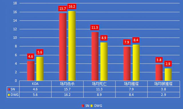 从上图可知,在进攻端DWG以16.2的场均击杀数高于SN的15.7,以场均8.4的推塔数高于SN的7.9,这说明在整体进攻端上,DWG占据了上风;而从DWG场均更少的死亡数(8.9)以及场均2.9座的被推塔数,我们可以看出,DWG在防守端一样做得非常好。
