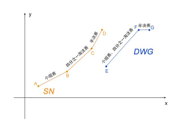 为了方便大家了解两队在本次世界赛上的状态变化,我特意做了下图所示的坐标图,由于没有明确的数据做支撑,只能粗略的描述到大体的位置,大家着重从整体上理解就好。