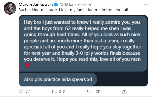 G2的打野选手Jankos在推特上分享了一则来自粉丝的暖心消息: