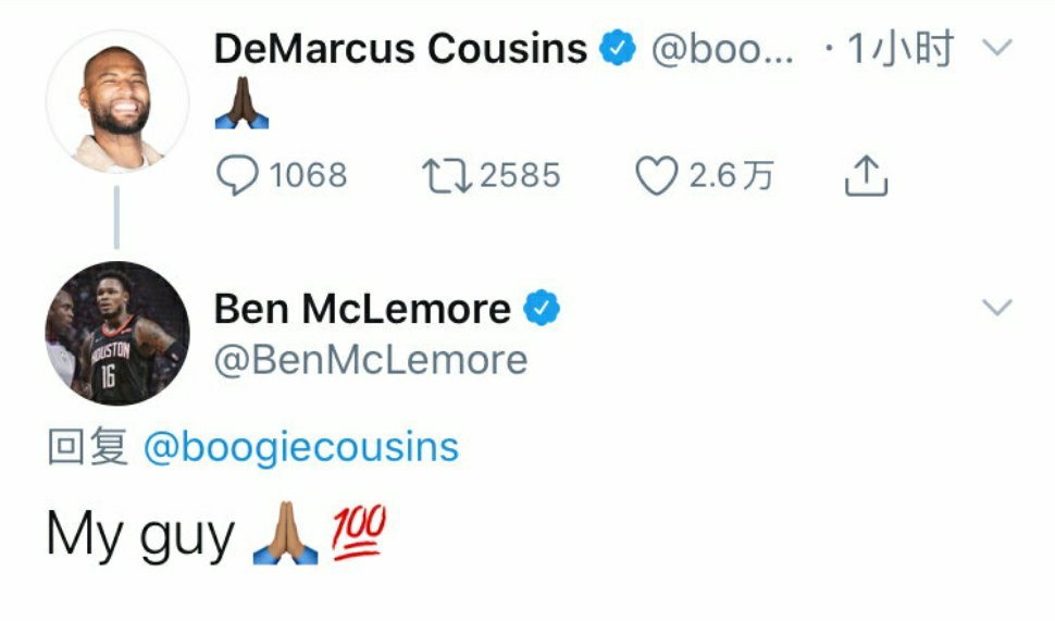 在消息被爆出来前6分钟,考辛斯在社交媒体上发了一个双手合十??的表情,前国王队友现火箭队友麦克勒莫随后转发评论道:“我的伙计????”