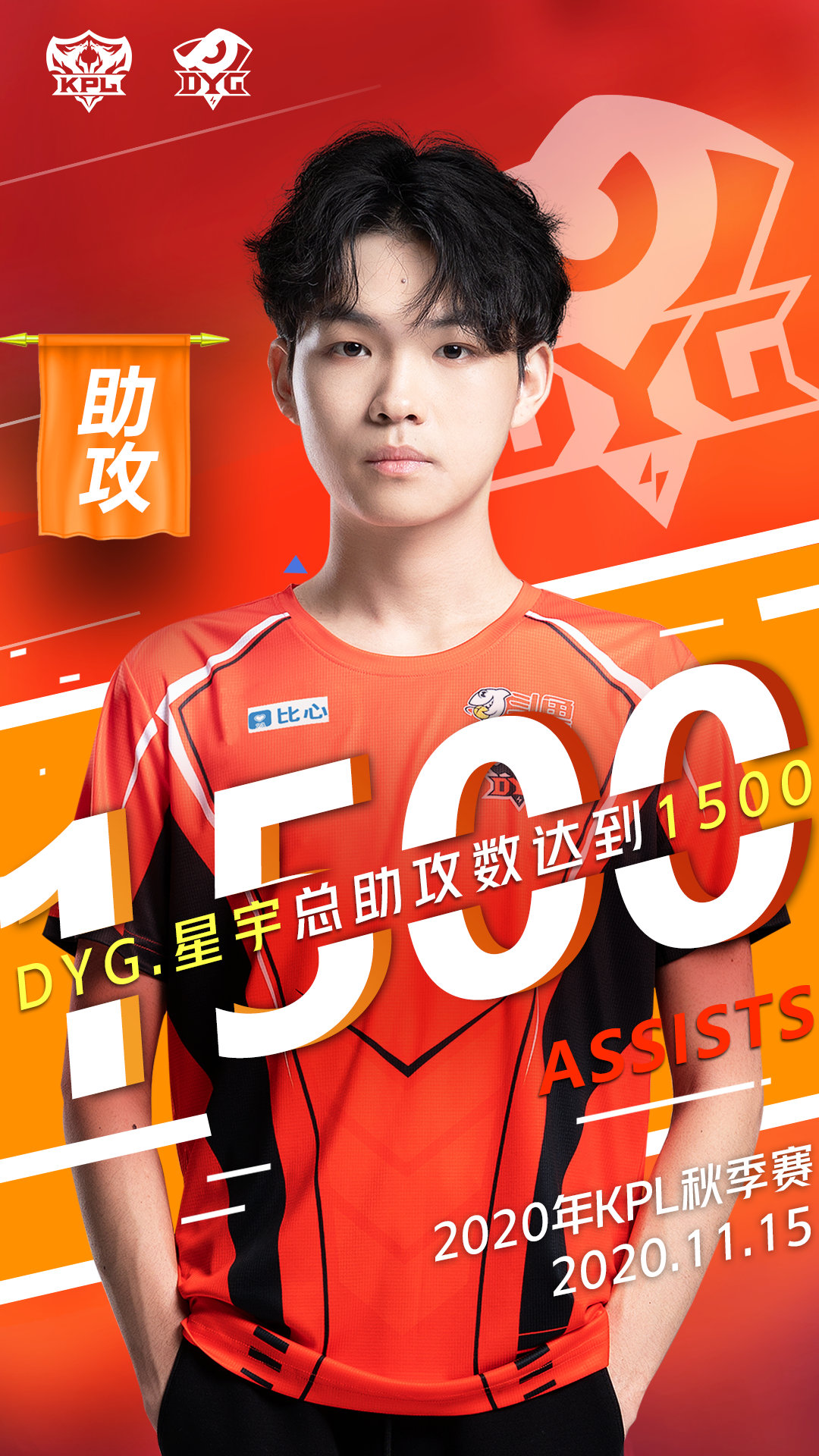 在2020年11月15日广州TTG对阵到DYG的第2局比赛中,DYG.星宇使用太乙真人配合队友完成击杀,达成个人KPL职业生涯的1500助攻成就!