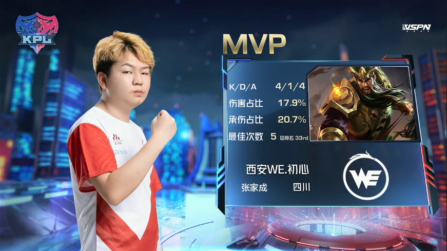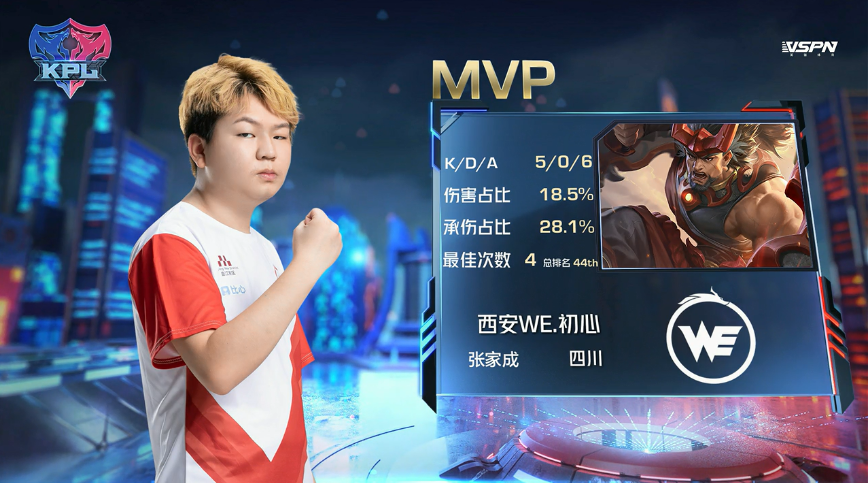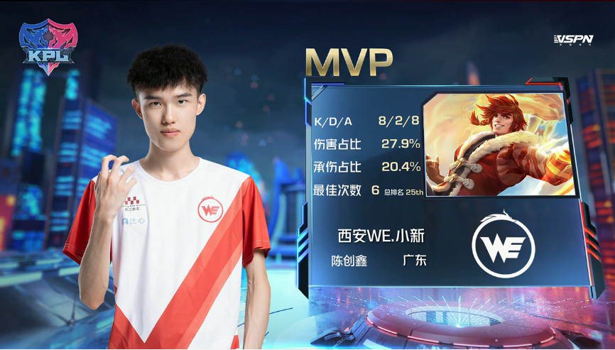 本场比赛的三局MVP分别给到西安WE.初心的廉颇、关羽,以及西安WE.小新的裴擒虎。