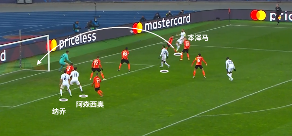 ?本场阿森西奥几次打肋部的攻击很有威胁,不过上半场的2次机会,1次打门柱,另外1次打飞了,下半场纳乔的后点头球(中路是阿森西奥,传中的是本泽马)同样顶飞了,是皇马进攻投入没有回报的镜头。?