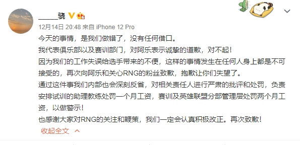 粉丝在超话中爆破管理层,RNG战队经理随后在微博中道歉,将扣除试训教练经理1个月工资,扣除管理层2个月工资的处罚。