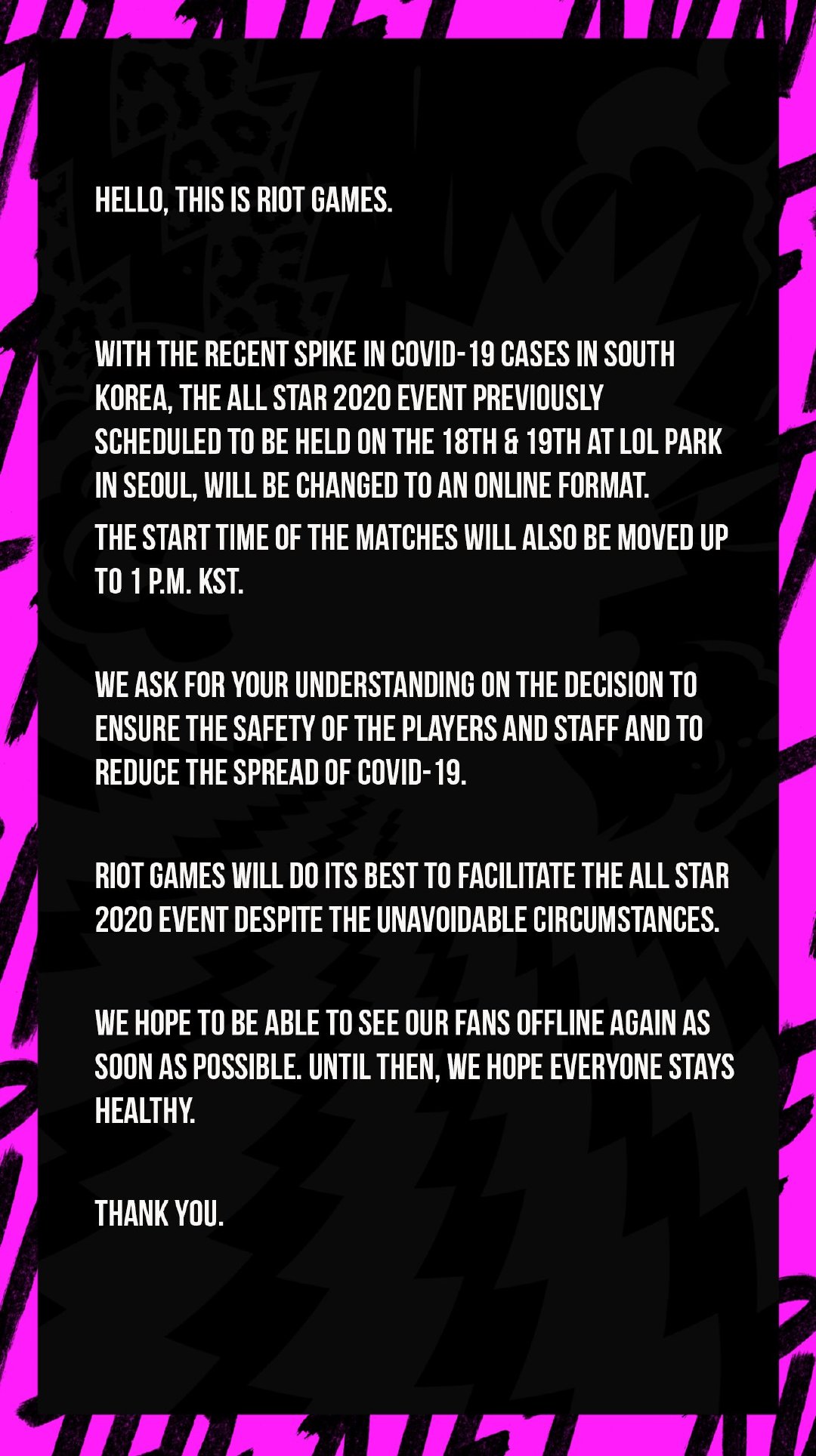 LCK全明星赛,由于疫情原因原定18.19号在LOL公园举行的全明星赛改为线上比赛,比赛时间调整为韩国时间下午1点。