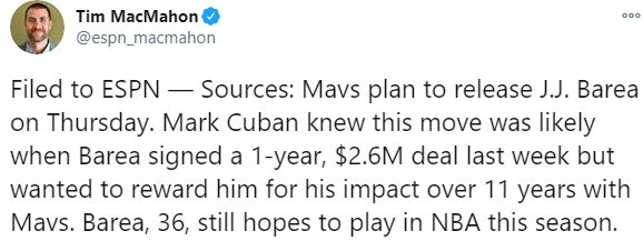 上周巴里亚1年260万美元续约的时候库班就知道可能会有这一步操作了,独行侠这么做是为了奖励巴里亚过去11年里对独行侠的贡献,他是独行侠2011年夺冠的主要功臣之一。