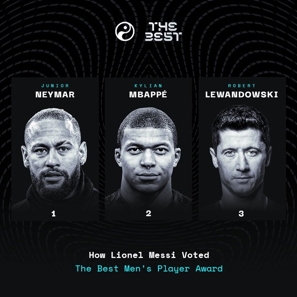梅西的3张选票依次是:1?内马尔,2?姆巴佩,3?莱万。