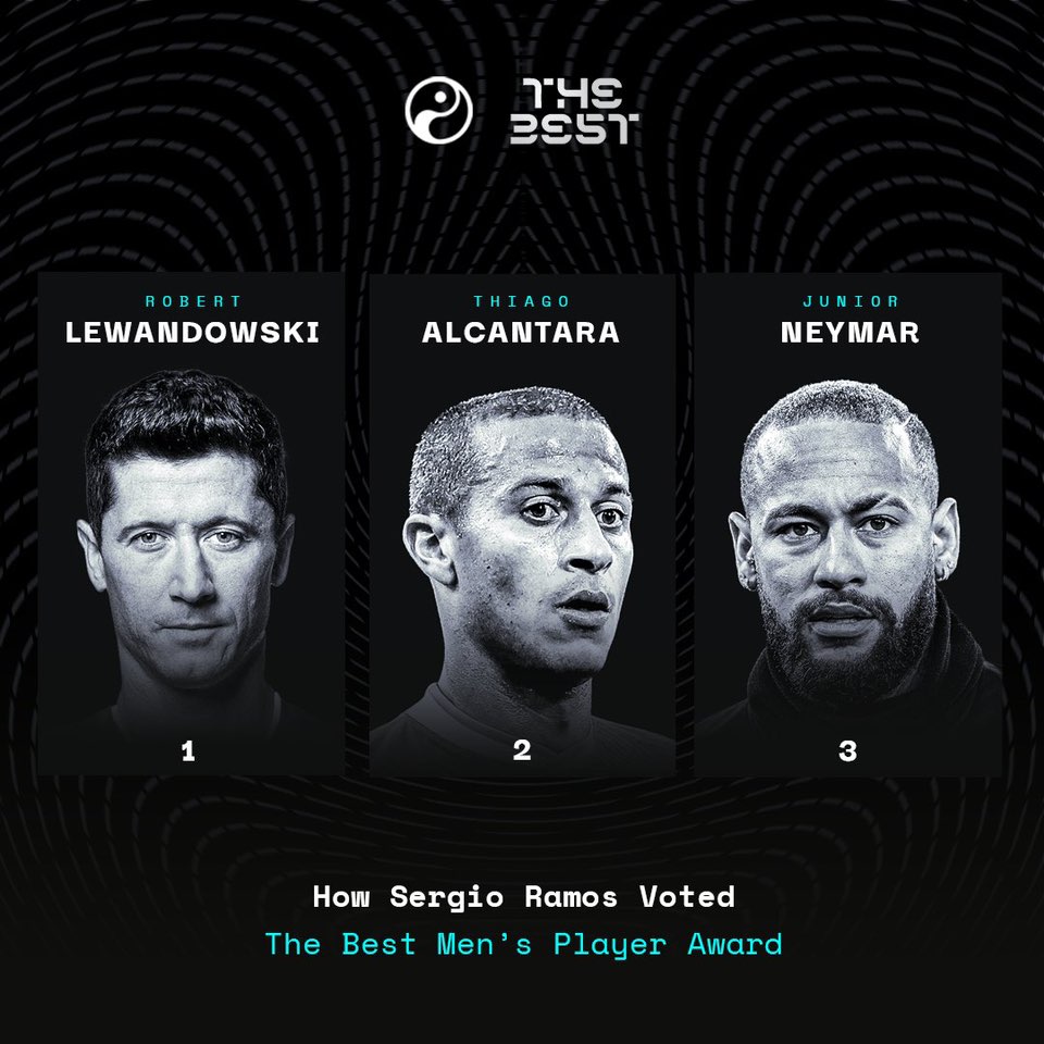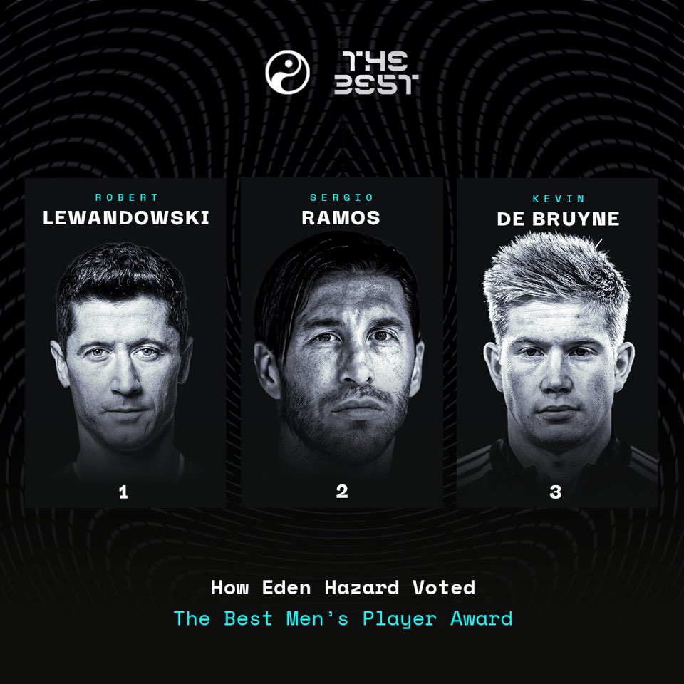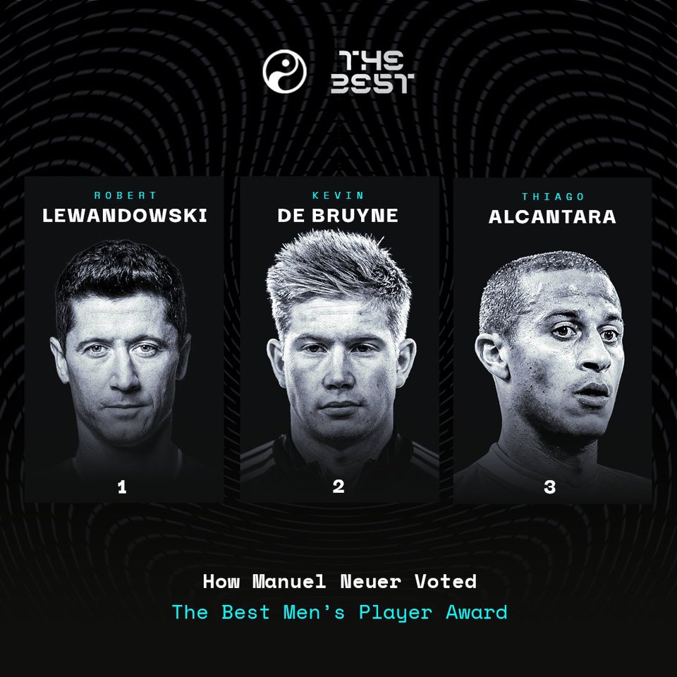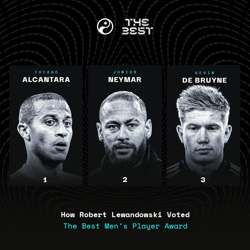 莱万的3张选票依次是:1蒂亚戈2内马尔3德布劳内