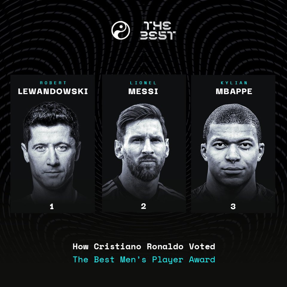 国际足联公布了2020年度最佳球员,拜仁前锋莱万当选。据记者Rob?Harris透露,C罗的投票顺序为莱万、梅西和姆巴佩。