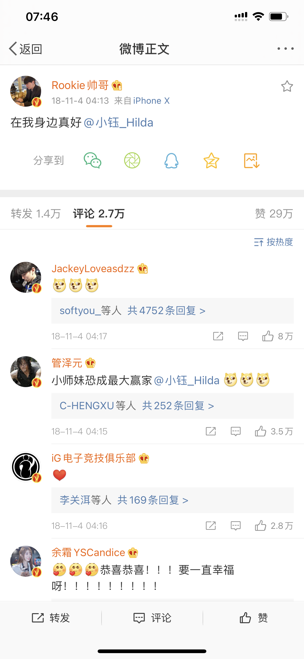 IG中单选手Rookie在2018年11月4日在S8全球总决赛夺冠之后,公开女朋友解说小钰,小钰随后转发微博称“有你在身边真好”
