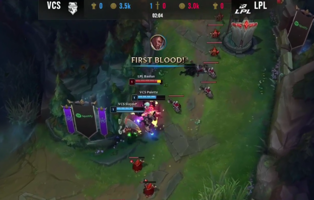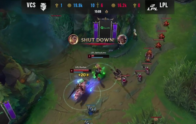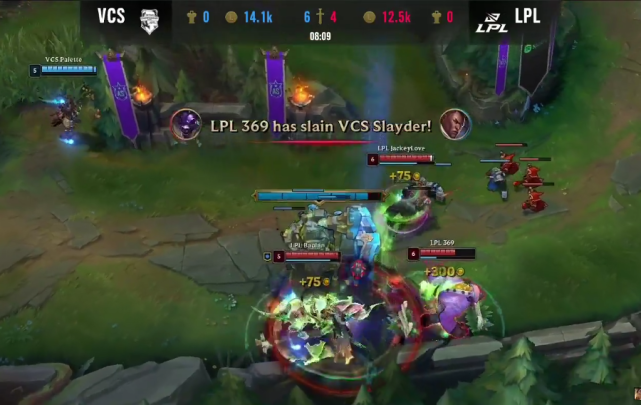 然而在后续的推塔中,VCS形成反包,LPL再次团战失利。20分钟左右,LPL的经济已经落后一万。22分钟,369牛头开团未果,VCS加里奥冲入人群,LPL团战无力抵挡,被打出团灭!