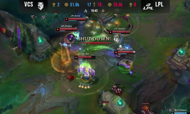 接下来双方频频爆发乱战,VCS的加里奥装备太好,一套技能伤害奇高,LPL根本承受不住,此时rookie的战绩已经来到0-8,成功超鬼!不过15分钟左右,LPL在中路找到机会,rookie先行一箭命中卢锡安,将其击杀,随后又围殴了迷路的加里奥!
