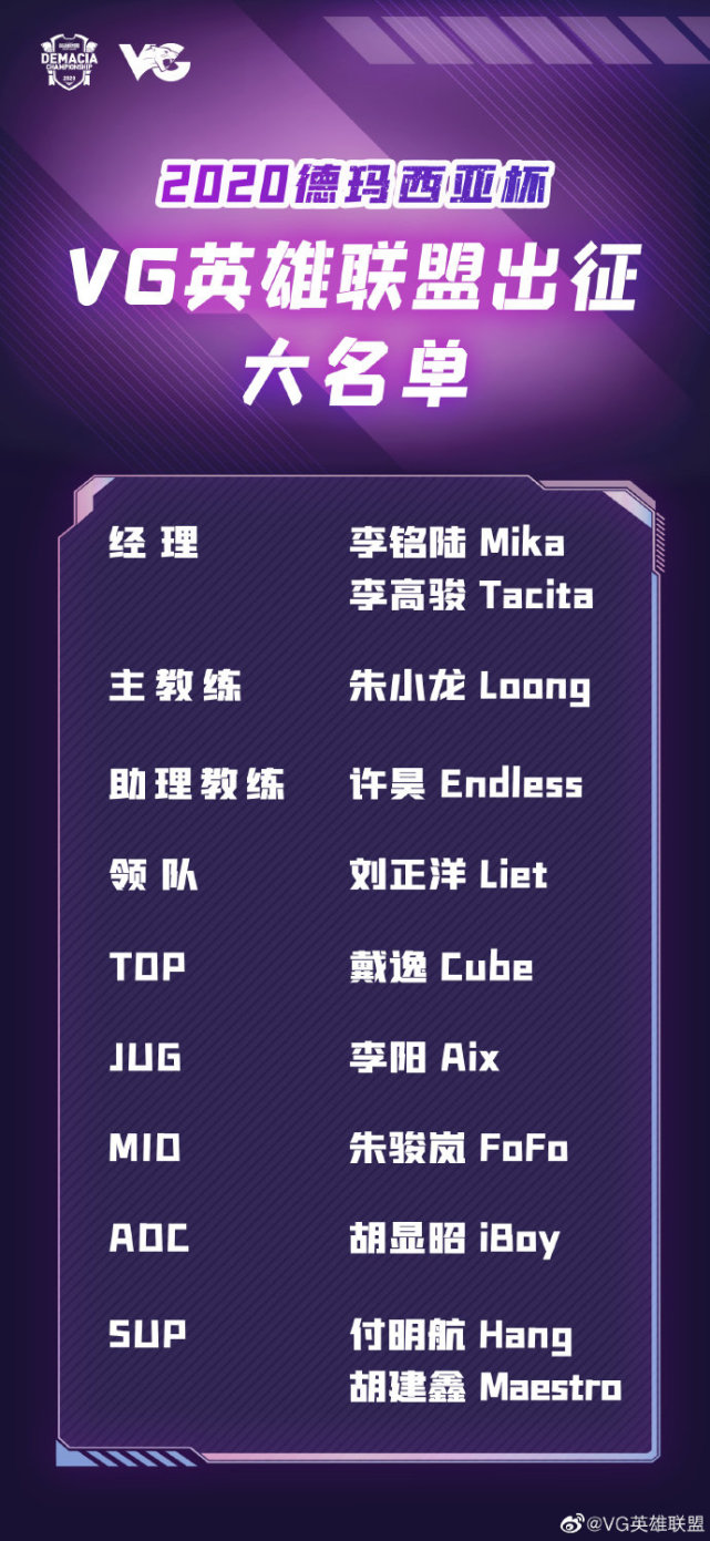 VG这次的德杯出征名单基本上就是新赛季的主要阵容,主教练是Loong、助理教练Endless,上单Cube、打野Aix、中单Fofo、ADC是iBoy,辅助则是Hang和小胡两人。乐言由于禁赛的缘故,并没有出现在这次德杯的名单,不过等到明年春季赛,大家就可以看到他的身影。