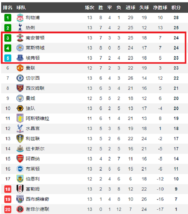 我们不妨拿英超第13轮和第11轮的积分榜做个简单的比较,仅仅2轮比赛,英超前6的座次就有了很大的不同,足见英超竞争有多么激烈。