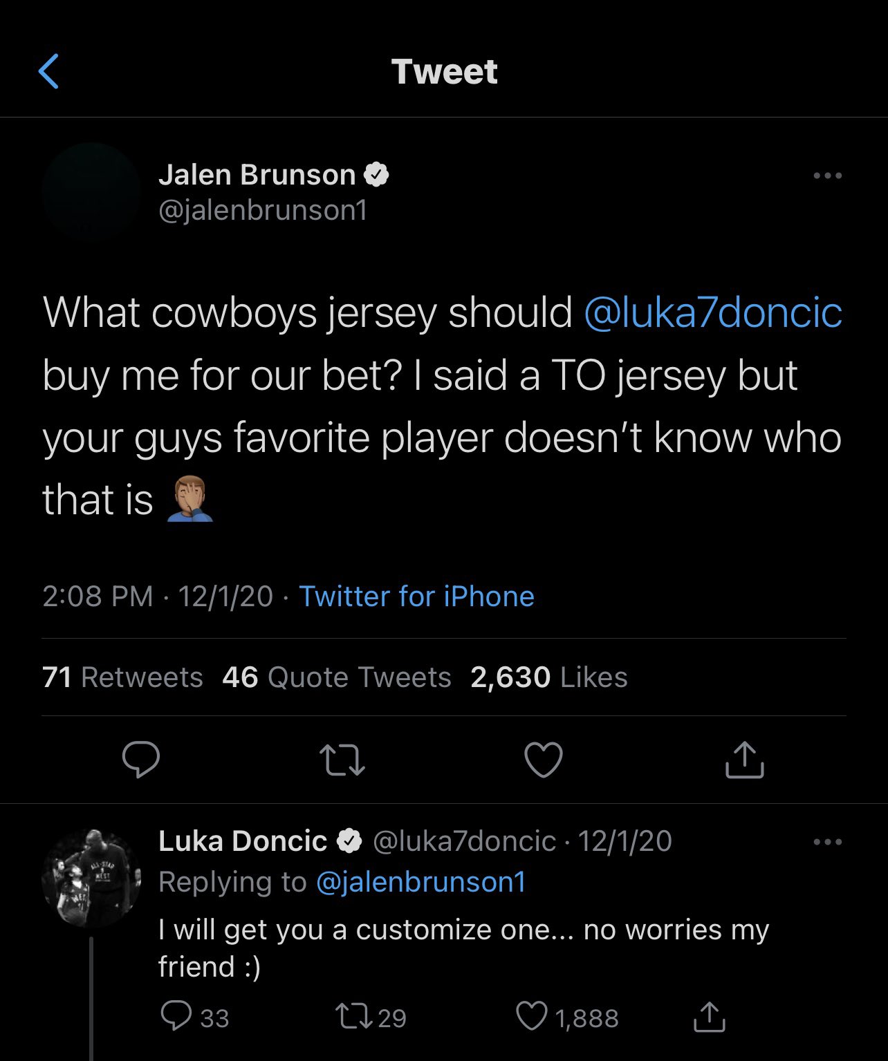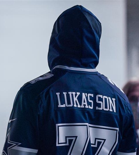 杰伦-布朗森和东契奇打赌输了,今天穿上了后背印着“卢卡的儿子”达拉斯牛仔队球衣入场,哈哈哈哈哈。