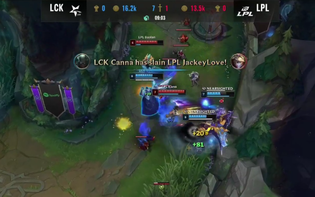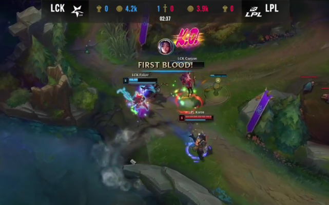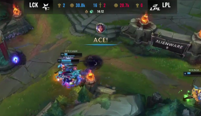 11分钟,LCK四人集结下路,形成包夹,LPL下路双人组和打野全部阵亡!随后就成了LCK单方面的屠杀,14分钟派克直接收获三杀,LCK在中路将LPL团灭,领先1w经济!