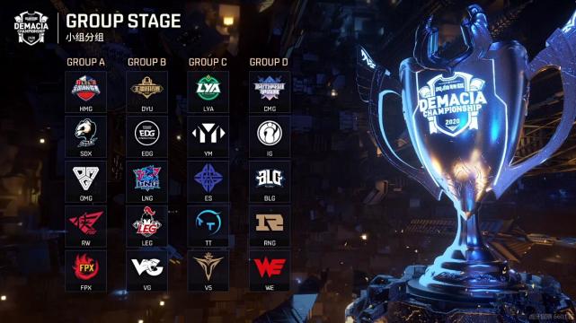 北京时间12月19日晚上,德玛西亚杯迎来了抽签分组仪式,这一次的抽签规则和过去稍有不同,由4支大众赛事队伍随机抽签分别进入到四个小组赛,接着按照“蛇形”的顺序,由上一轮的队伍选择下一轮的队伍,并且最后A5-D5四支队伍有调整组别的机会,最终分组结果如下:A组:HMG、SDX、OMG、RW、FPXB组:DYU、EDG、LNG、LEG、VGC组:LYA、YM、ES、TT、V5D组:CMG、IG、BLG、RNG、WE四支种子队伍抽签分组:A组晋级战队对阵TES;B组晋级战队对阵SN;C组晋级战队对阵JDG;D组晋级战队对阵LGD