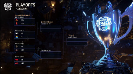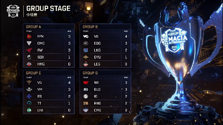 德玛西亚杯小组赛于今日结束,FPX,VG,V5,WE携手晋级八强,他们分别将会在八强遇上TES,SN,JDG,LGD。