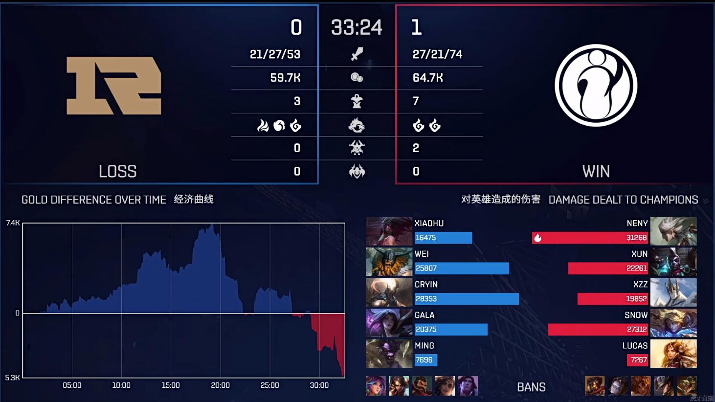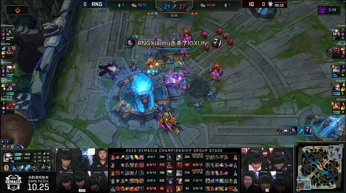 在20分钟的时候,IG趁着抓死小虎的契机逐个击破击杀RNG四人,顺势拿下大龙一举抹平了经济差。1分钟后,两队在小龙处爆发团战,IG再次打出团灭,比赛再度充满悬念。不过后面几次团战,RNG在先手开团方面都做得不错,无奈团战解决不了IG的上野,最终都出现了团战的溃败,在32分半钟的团战中,RNG在率先秒掉IG双人组的情况下被击杀四人,最后被IG成功翻盘拿下胜利。