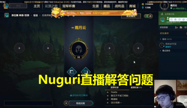 Nuguri在直播的时候主要以回答粉丝的问题为主,其中就谈到了自己喜欢听的歌曲等,Nuguri表示会随着不同的时间段做出改变,有时候会听Rap、有时候会听钢琴曲等...而在谈到加入FPX后,最想和队内哪位选手快点亲近起来时,Nuguri表示队内的辅助刘青松打得很不错,也想和他在游戏内变得很亲近。其实想和每位选手都变得亲近,但是现在都还没见过,所以还不太清楚。