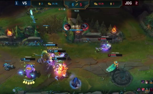带着大龙buff,JDG从下路推进,V5前来阻止,惨遭团灭!JDG顺势一波结束比赛,3-1战胜V5挺进四强!